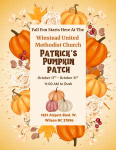 Pumpkin Patch – Daily (except Sundays) from October 17 – 31, 11:00 am to dusk.