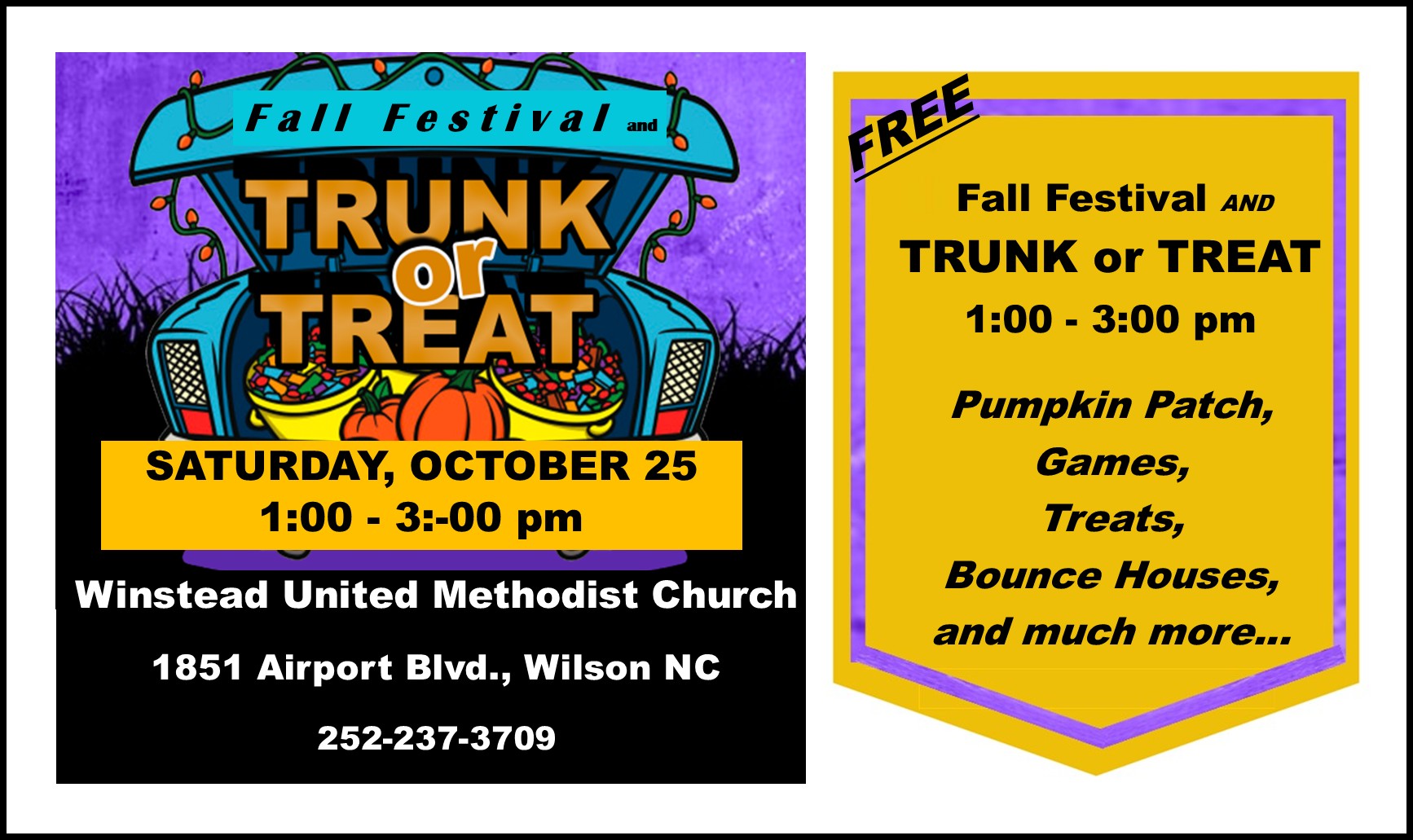 Fall Festival and Trunk or Treat – Saturday, October 25 from 1:00 – 3:00 pm